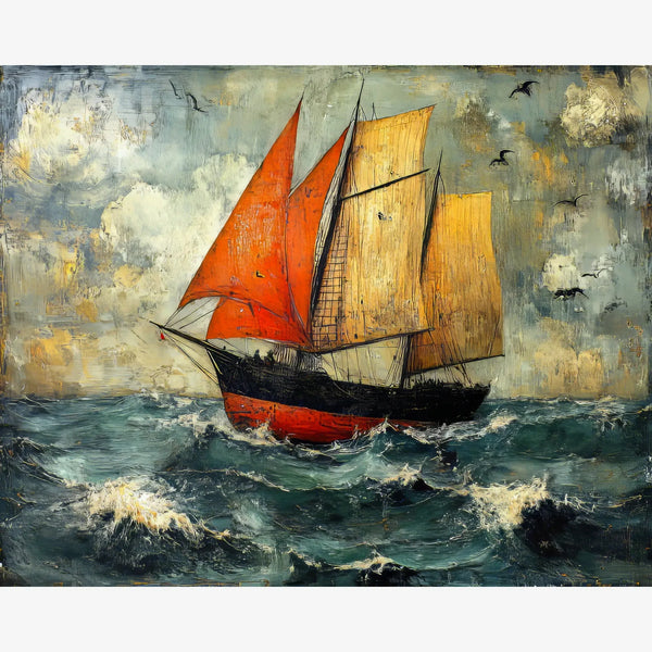This Across the Restless Sea diamond painting features a sailboat braving waves beneath a wide, open sky. The design keeps the shapes clear and the color blocks bold, making it easy to work through while still feeling expressive. It's a great pick for anyone who loves coastal scenes and timeless nautical art.