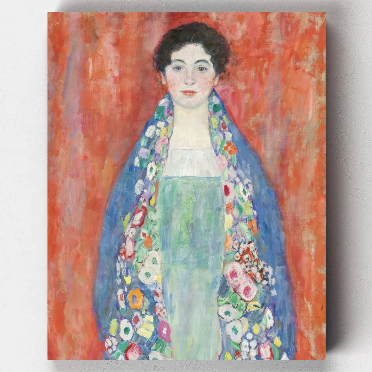 This piece is less golden and leans into gentle expression and soft color. You'll see Klimt's fanciful style and ability to render symbolic gestures while softening edges by painting the pastel-finished dress, the red flowered shawl, and the coral background. This is a nice way to become one with one of his less ostentatious portraits.