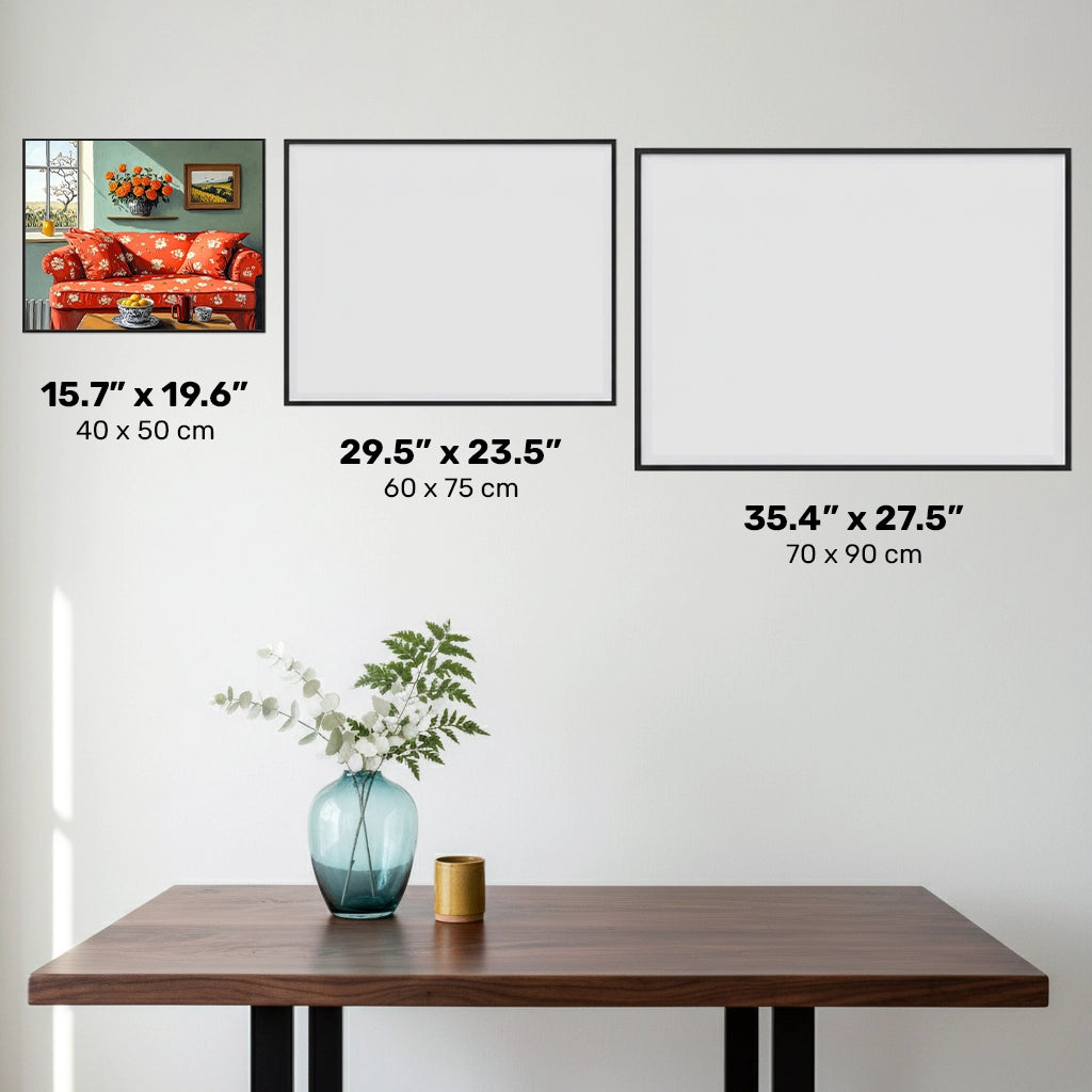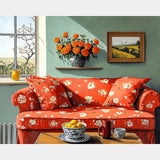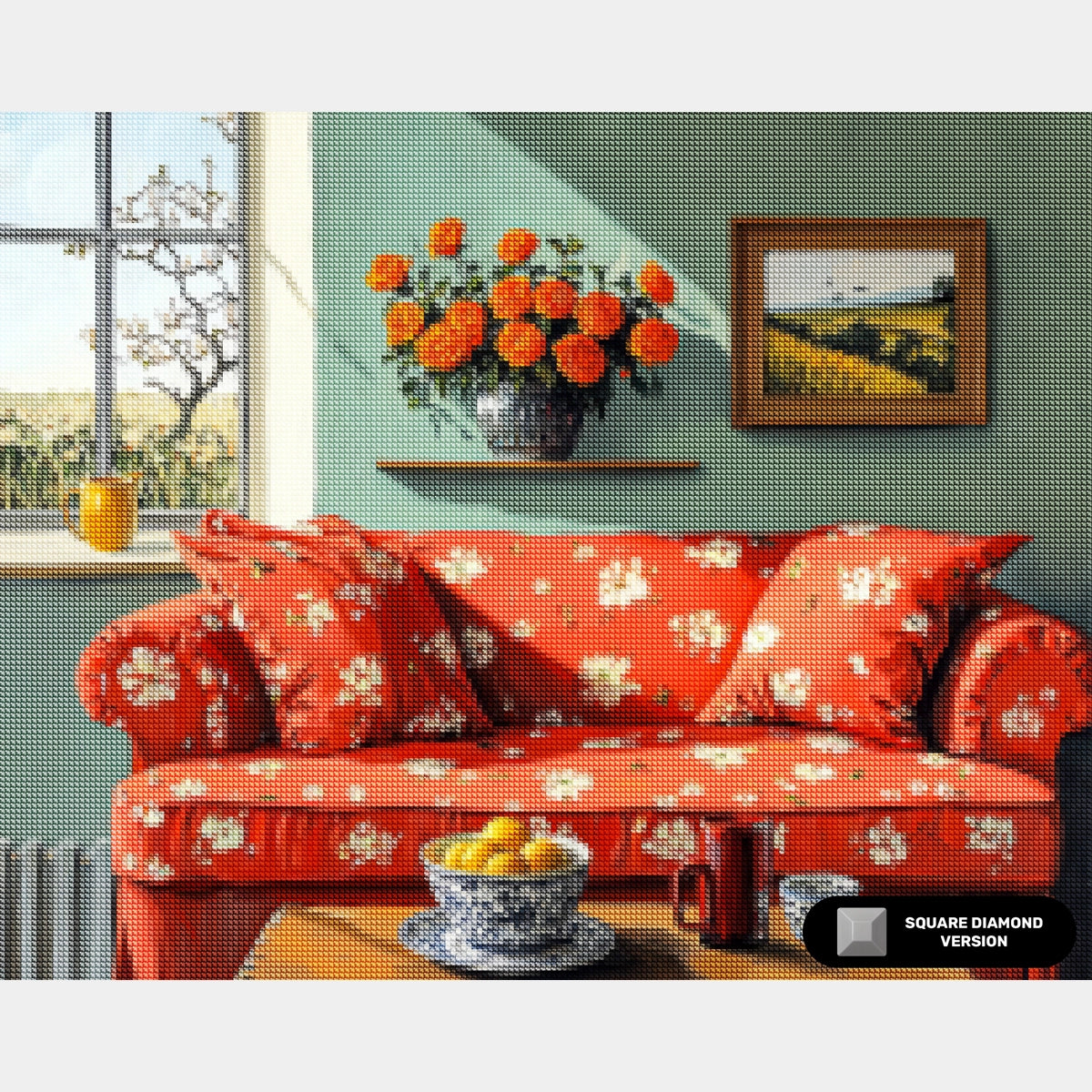 This cozy living room diamond art features a charming interior with a patterned red sofa, glowing sunlight, floral accents, and peaceful countryside views outside the window. A relaxing craft that brings warmth to any space.