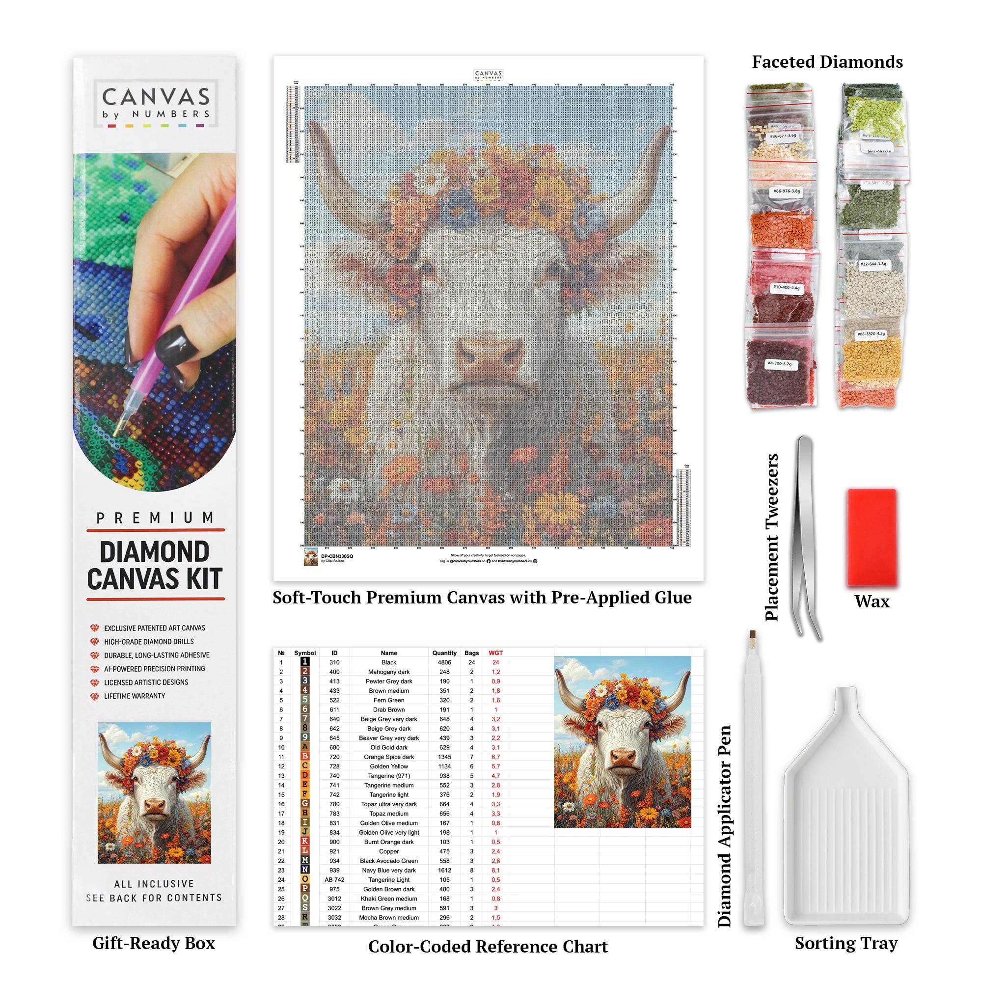 This Blooming Horns Cow diamond painting is the excellent blend of country and whimsy. The cow's face is the focal point, centered and rather serene, while the bright colors of the flowers nestled in between the horns add a pop of warmth and personality. The outline is easy to trace, and it's a charming image without being too complex, so it's an ideal option for an afternoon with low expectations.