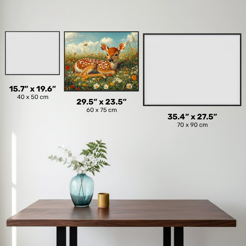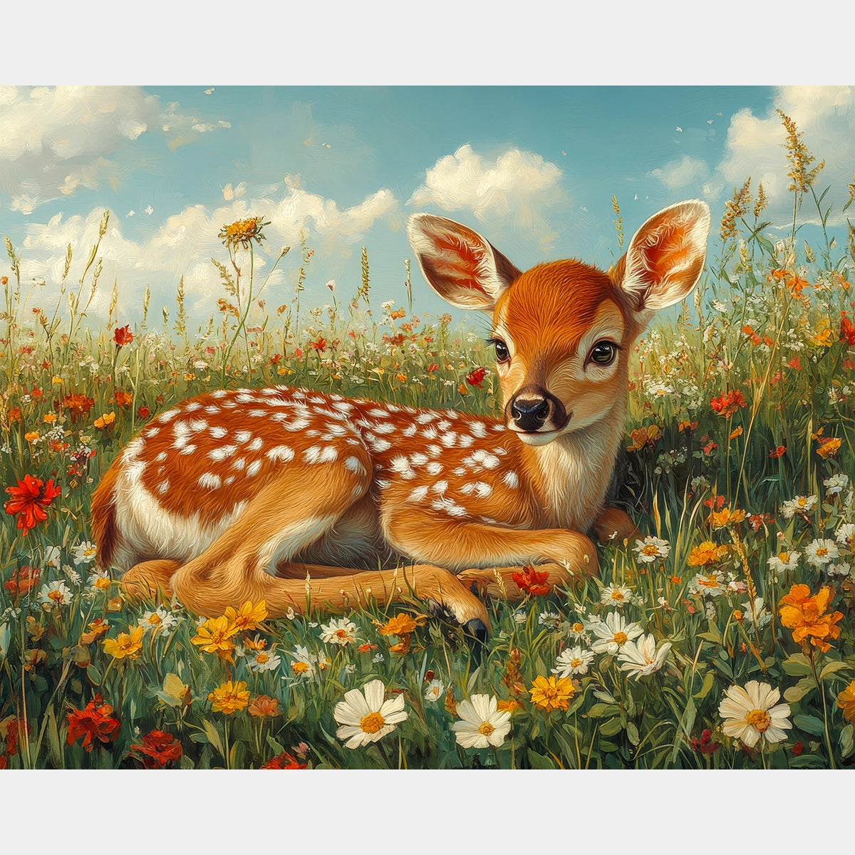This Innocent Fields diamond painting captures a peaceful fawn resting among wildflowers, bathed in warm sunlight and soft summer hues. The gentle details and natural setting make it perfect for anyone who loves serene and heartwarming wildlife art.