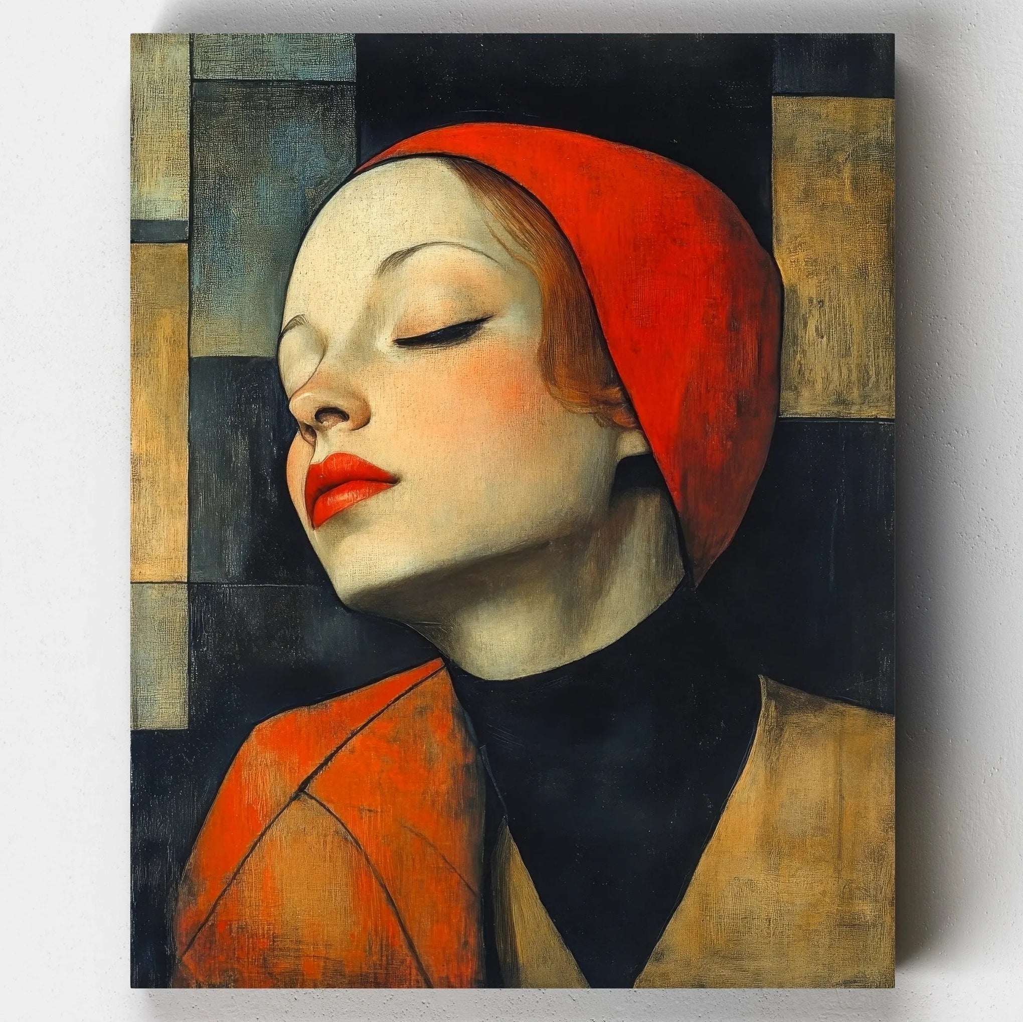 “Red Stillness” offers a striking female portrait painting experience with its confident expression and stylized color palette. The woman's closed eyes and composed features create a moment of reflection, while the rich reds and muted textures bring emotional depth to your wall art.
