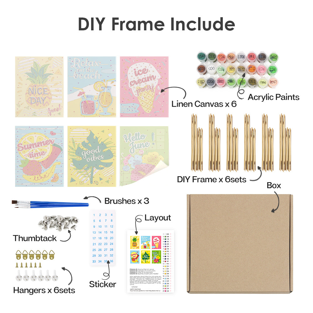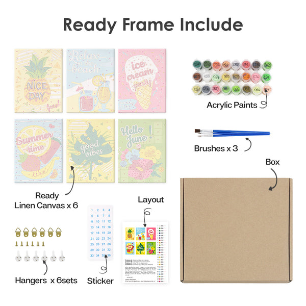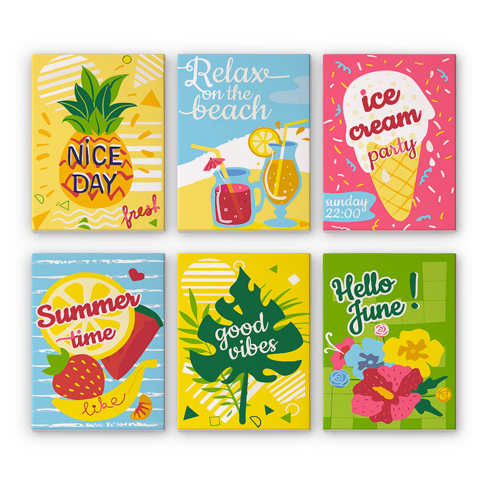 Paint by numbers mini set full of summer joy—from watermelons to beach balls to popsicles, each image is a taste of sunshine. Easy to create and match any home as you go.