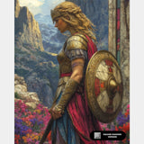 This Athena, Goddess of War diamond painting kit portrays a majestic warrior goddess standing in golden armor, holding her shield among vibrant mountain flowers. A powerful and elegant artwork for mythology lovers and fantasy art fans.