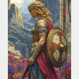 This warrior goddess diamond art captures the strength and grace of a battle-ready heroine, framed by epic mountain landscapes and rich floral colors. A stunning piece that brings mythic beauty into any home.