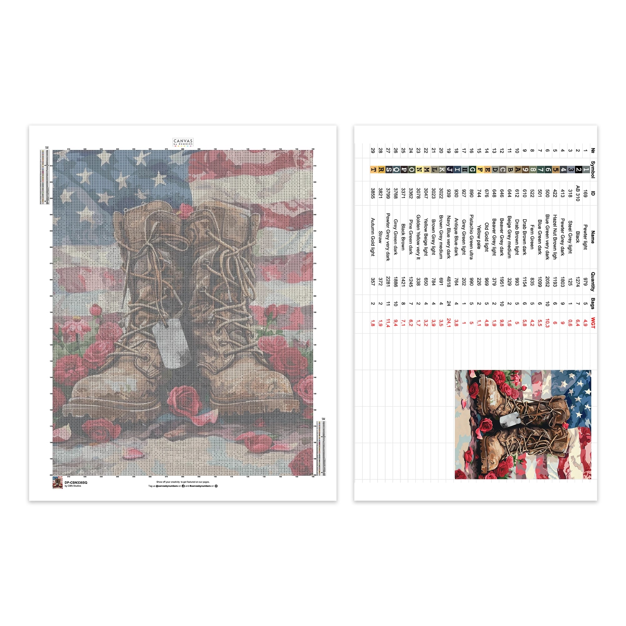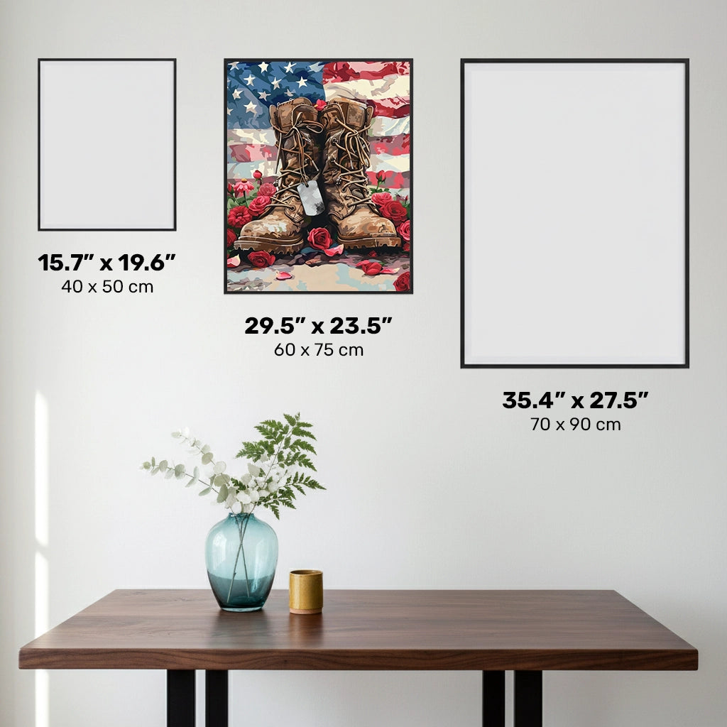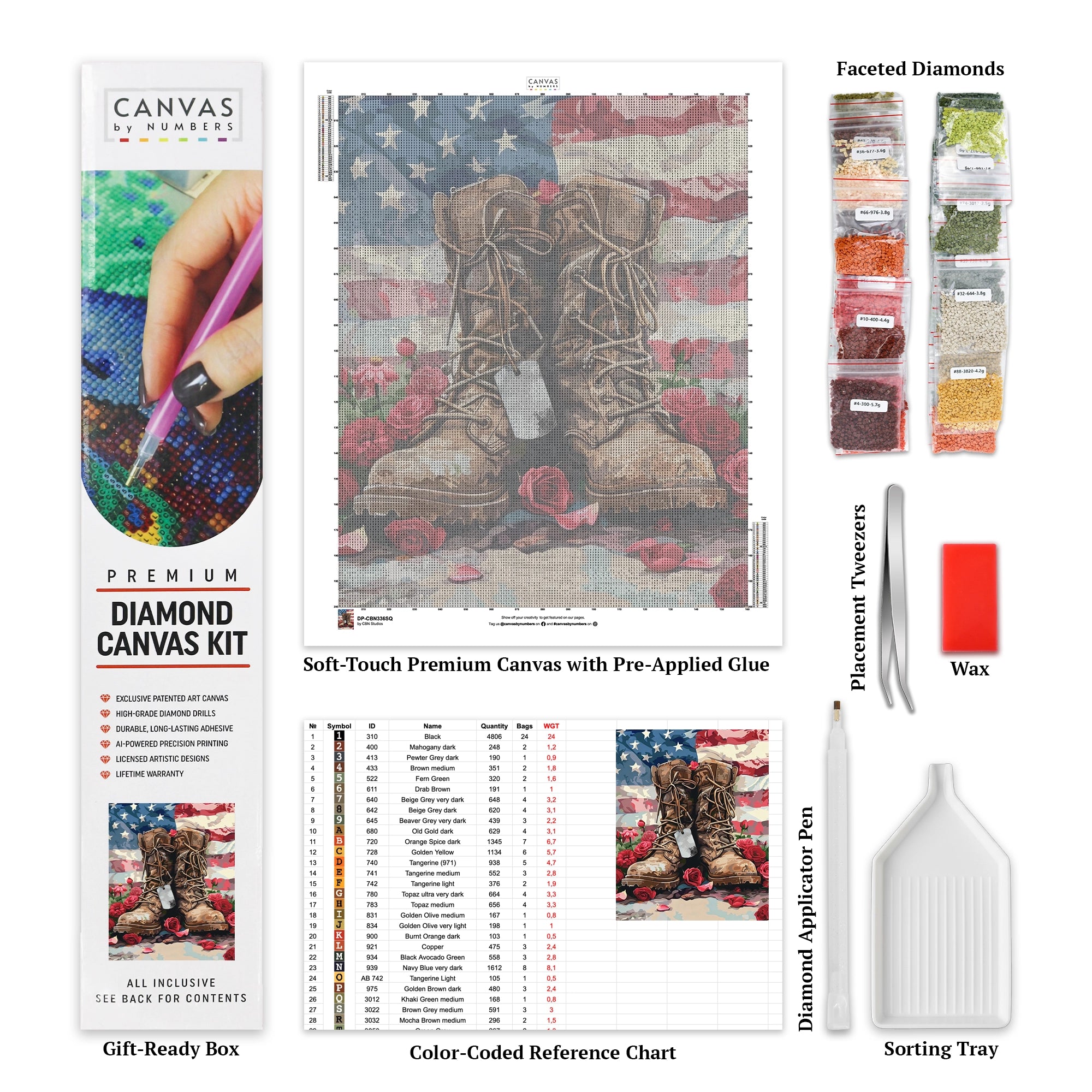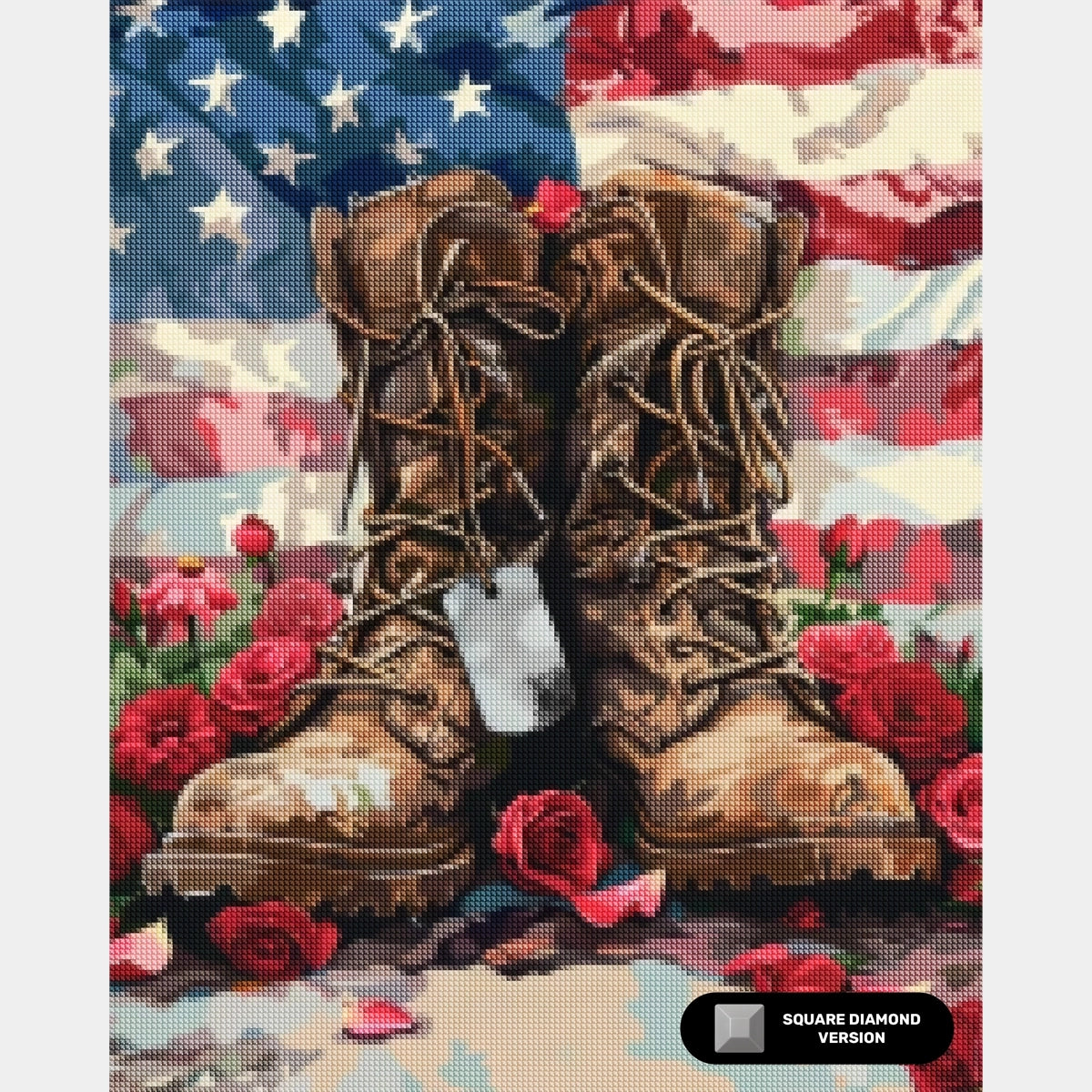 This In Remembrance diamond painting combines powerful symbols—a pair of military boots, a memorable tag, and a flowing American flag—with soft floral touches. The red roses and pink chamomile add a layer of care and warmth to the scene. It's a project that feels personal and steady, perfect for those who want to create something in quiet tribute, either for themselves or as a gift of remembrance.