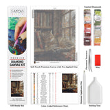 No matter if you're an avid reader or someone who appreciates the look of old bookstores, this bookstore diamond painting kit will provide peaceful scenery. The warm colors, slatted shelves, and details in the boards and wallpaper will make this a diamond painting project you return to during quiet hours, celebrating the beauty of having your nose in a book.