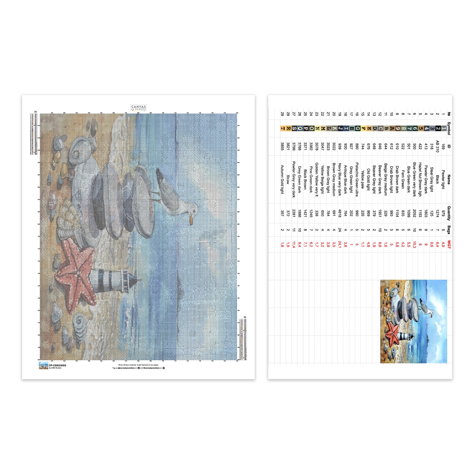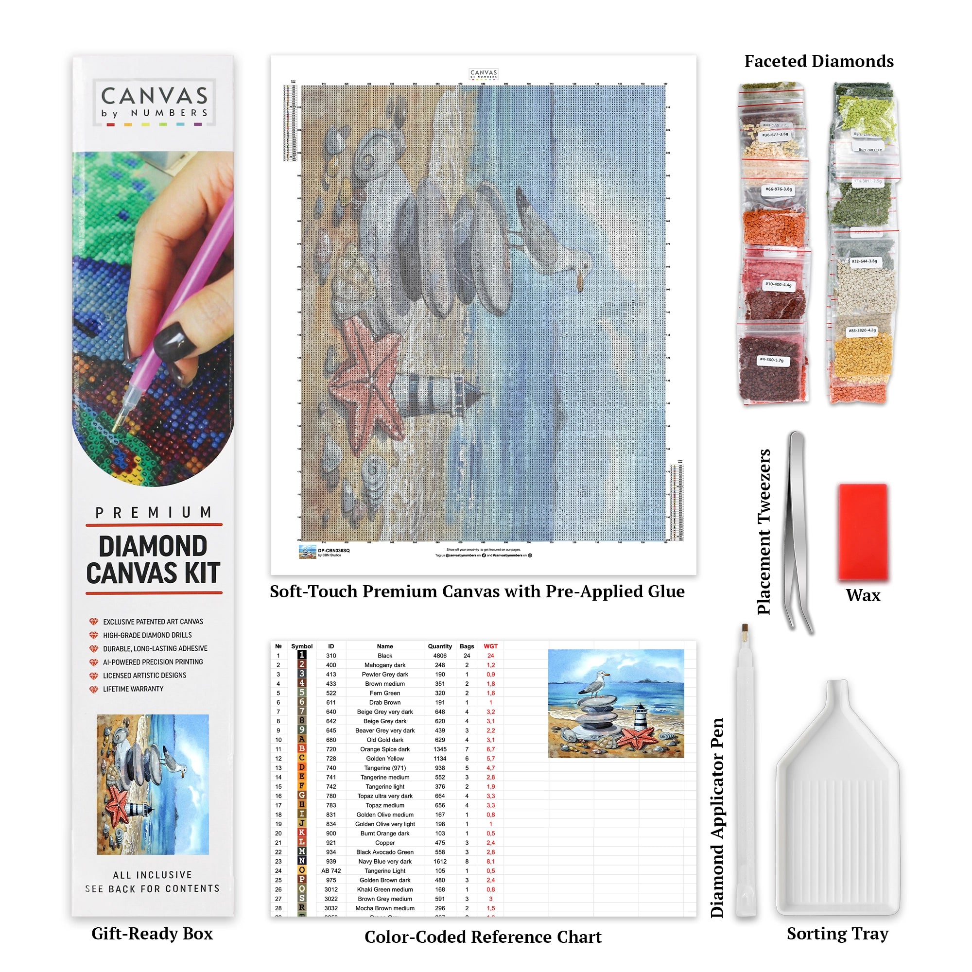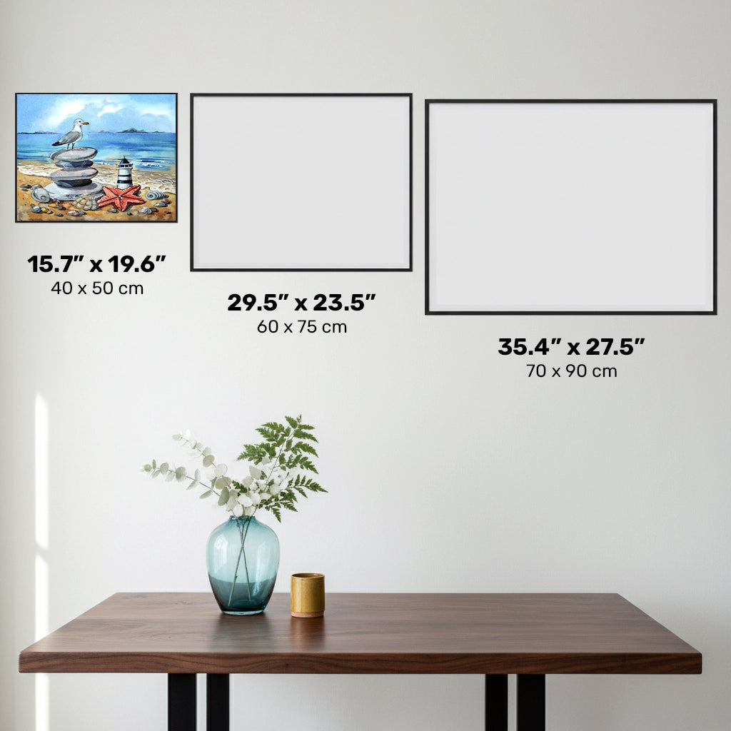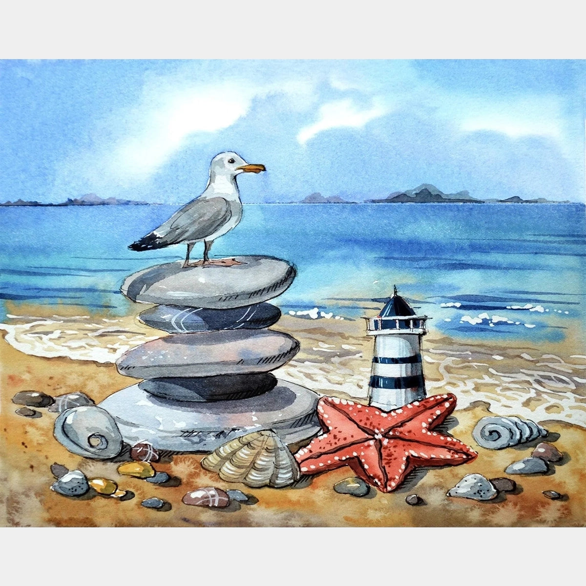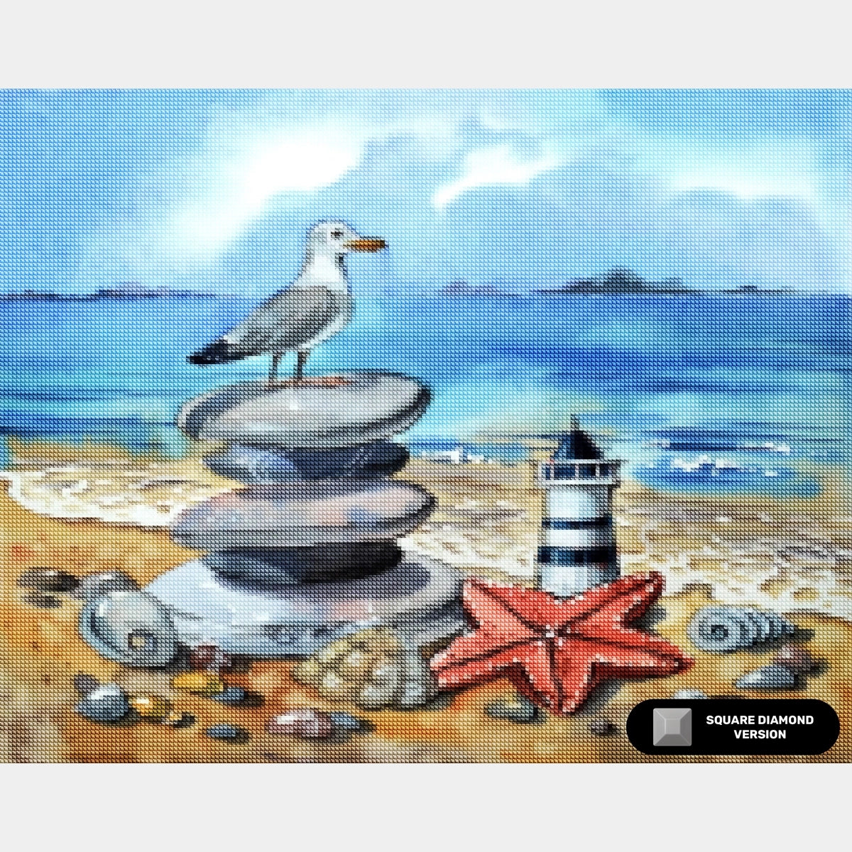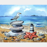In this stunning diamond painting, a miniature of the majestic lighthouse stands near the seashore, while a graceful seagull keeps watch over the shimmering sea. The scene is adorned with delicate pebbles, sea shells, and starfish, adding a touch of seaside charm to this captivating artwork.