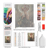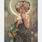 This The Moon and the Stars. The Moon (Detail) diamond painting captures the serene beauty of Mucha’s celestial muse. Draped in a starry veil and crowned with flowers, the figure glows softly beneath the crescent moon—an image of mystery, grace, and quiet wonder. It’s a mesmerizing piece for admirers of Art Nouveau and romantic symbolism.