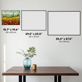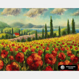 Boyan Dimitrov's masterpiece, the Tuscany landscape painting, captures the essence of a serene countryside adorned with vibrant poppy fields and nestled against a backdrop of majestic mountains.