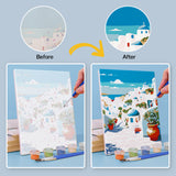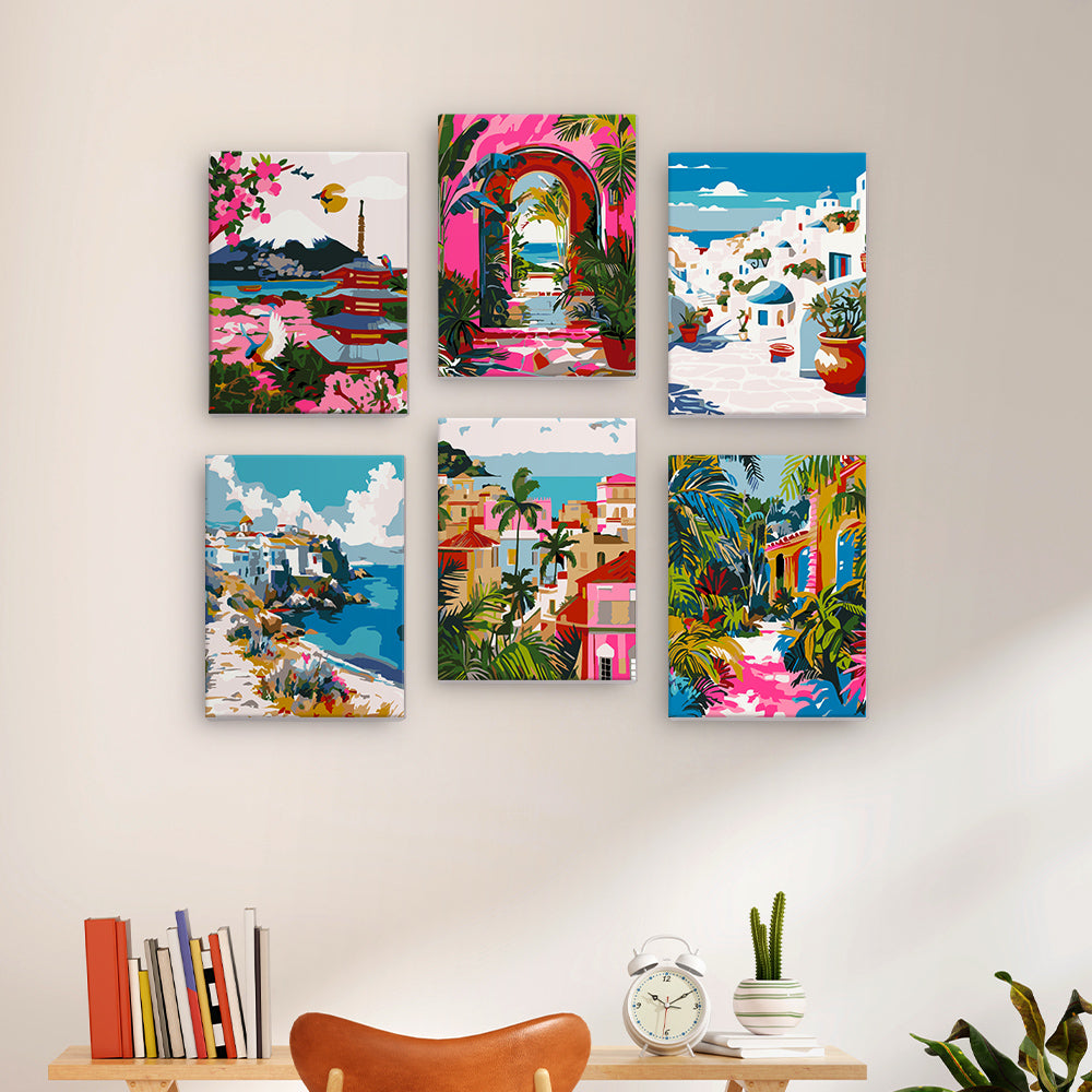 Each mini canvas in this Colorful Escapes kit offers a glimpse into a different part of the world. You'll see sunny coastal towns, vibrant courtyards, and peaceful island scenes. This is your chance to slow down and enjoy painting without feeling pressured or needing to be perfect.