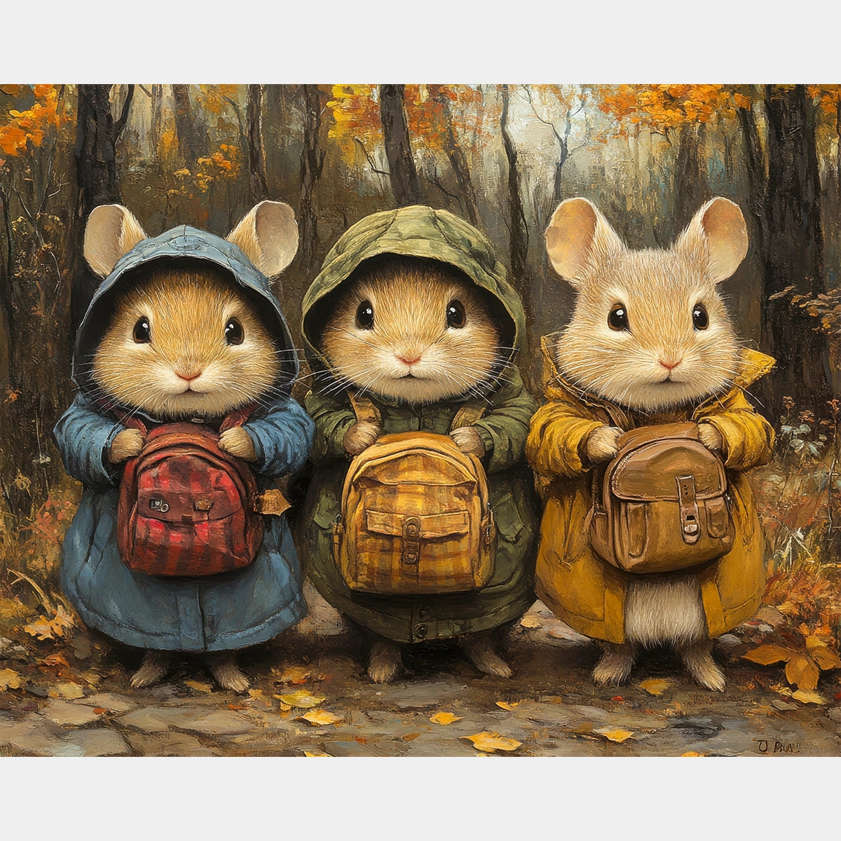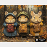 This Backpack Adventures diamond painting features three adorable little mice dressed in cozy coats, each holding a tiny backpack as they explore an autumn forest. A heartwarming scene perfect for anyone who loves cute woodland characters and warm seasonal colors.