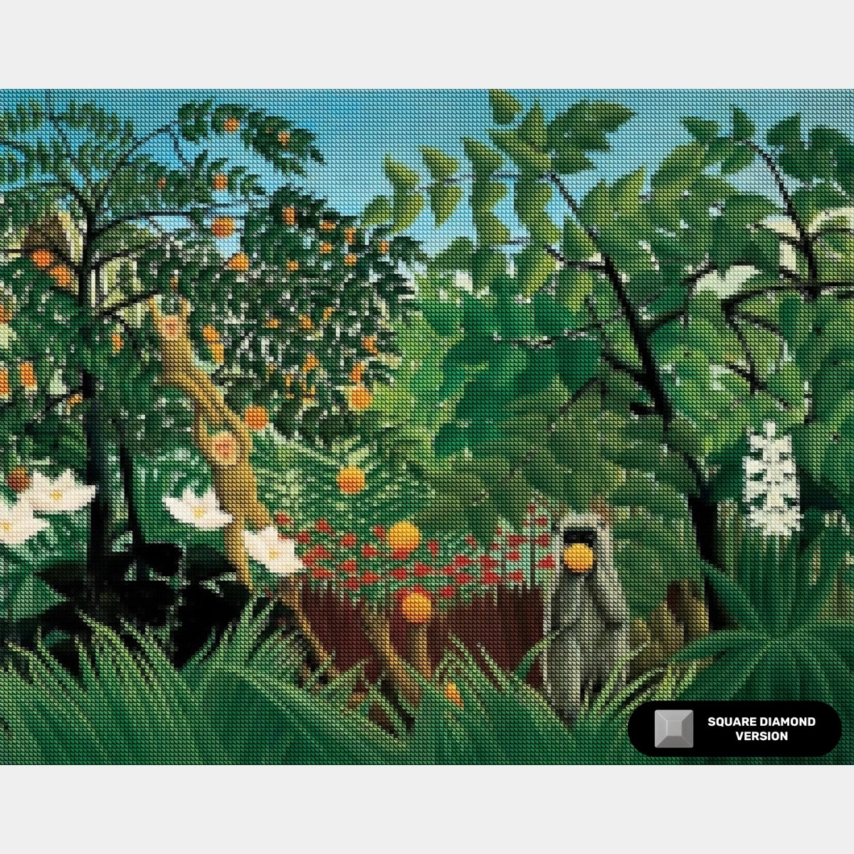 Explore the untamed beauty of Henri Rousseau’s "Exotic Landscape" with our diamond painting kit. This captivating scene brings a lush jungle filled with vibrant plants and mysterious creatures to life, capturing Rousseau’s unique style and love for nature. Perfect for art lovers, each diamond reveals intricate details, making this a stunning piece that celebrates the allure of untouched landscapes.