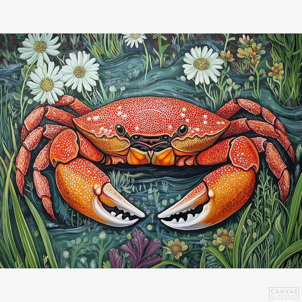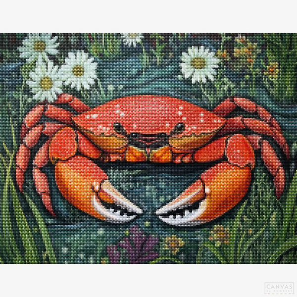 This Freshwater Crab diamond painting captures a quiet moment in nature—a reddish crab resting in shallow water with soft green plants all around. The scene is close-up but not complicated, with simple shapes and steady color blocks that make it easy to work through without much guesswork. A nice option for anyone who enjoys low-key, animal-centered designs.