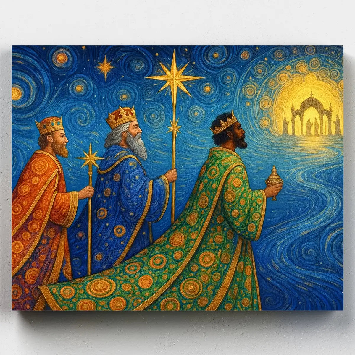 With Journey of the Three Kings, every brushstroke draws you deeper into the Christmas story. Paint three richly robed kings crossing a swirling night sky, guided by a radiant star toward a glowing city of golden arches and light.