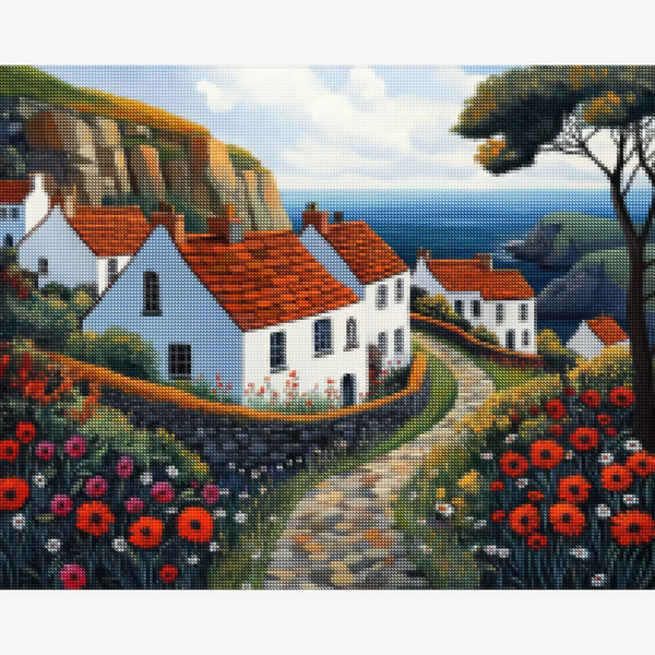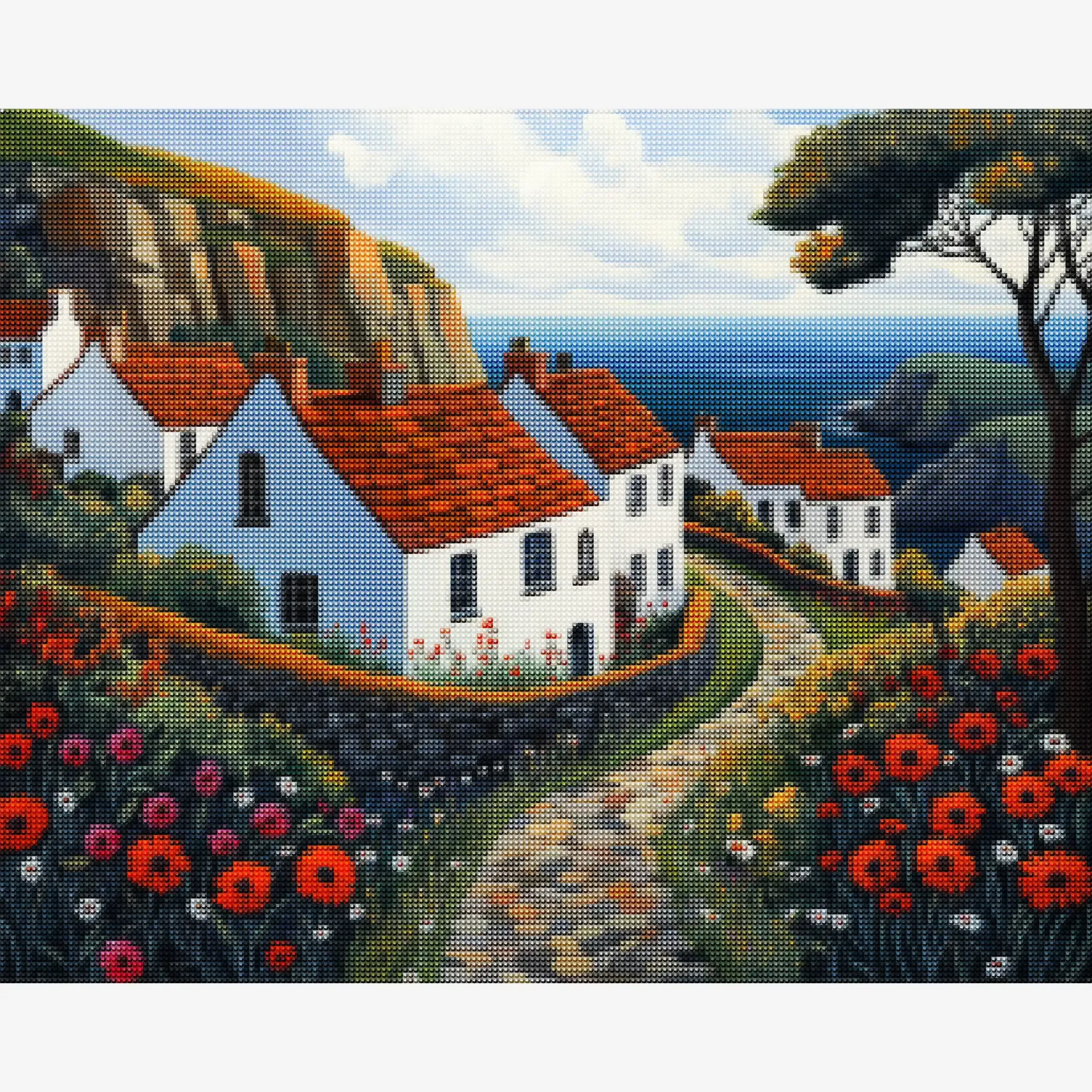 This Seaside Stone Trail diamond painting gives you a peaceful view of the coast, framed by flowers and greenery. The stone path draws your eye gently through the scene, and the soft blues and greens are easy on the eyes. It’s a nice project to settle into when you want something relaxing that still has a bit of movement and life.
