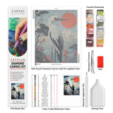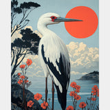 This Stork in Stillness diamond painting features a graceful white stork standing quietly by the water, framed by soft clouds, coral-red flowers, and a striking sun. A calm and elegant artwork perfect for nature lovers and minimalist interior styles.