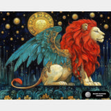 This The Slumbering Beast diamond painting portrays a regal lion resting beneath a sky filled with radiant golden stars. Its vivid red mane, ornate wings, and intricate decorative patterns create a stunning blend of myth and royalty. The deep blues and shimmering gold accents give the scene an enchanting, dreamlike presence.
