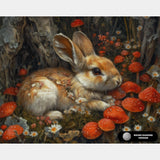 This Woodland Rabbit diamond painting captures an adorable rabbit resting among red forest mushrooms, moss, and tiny wildflowers. A richly detailed and heartwarming nature scene perfect for animal lovers.