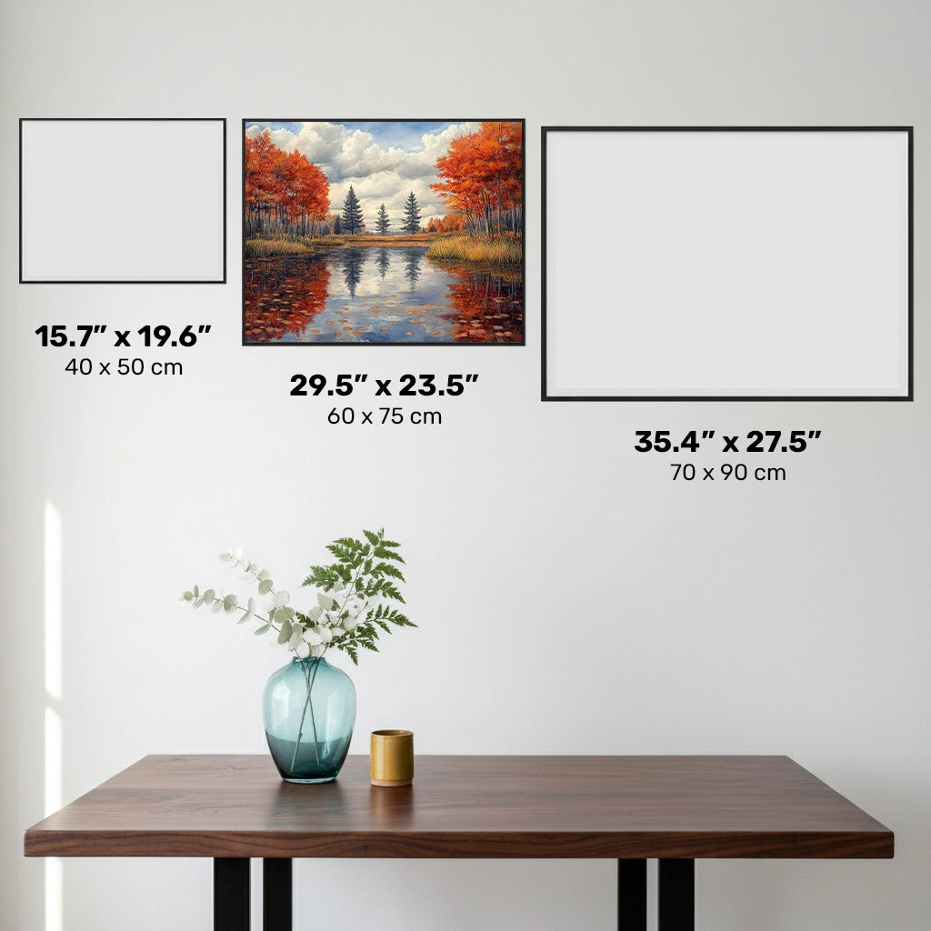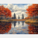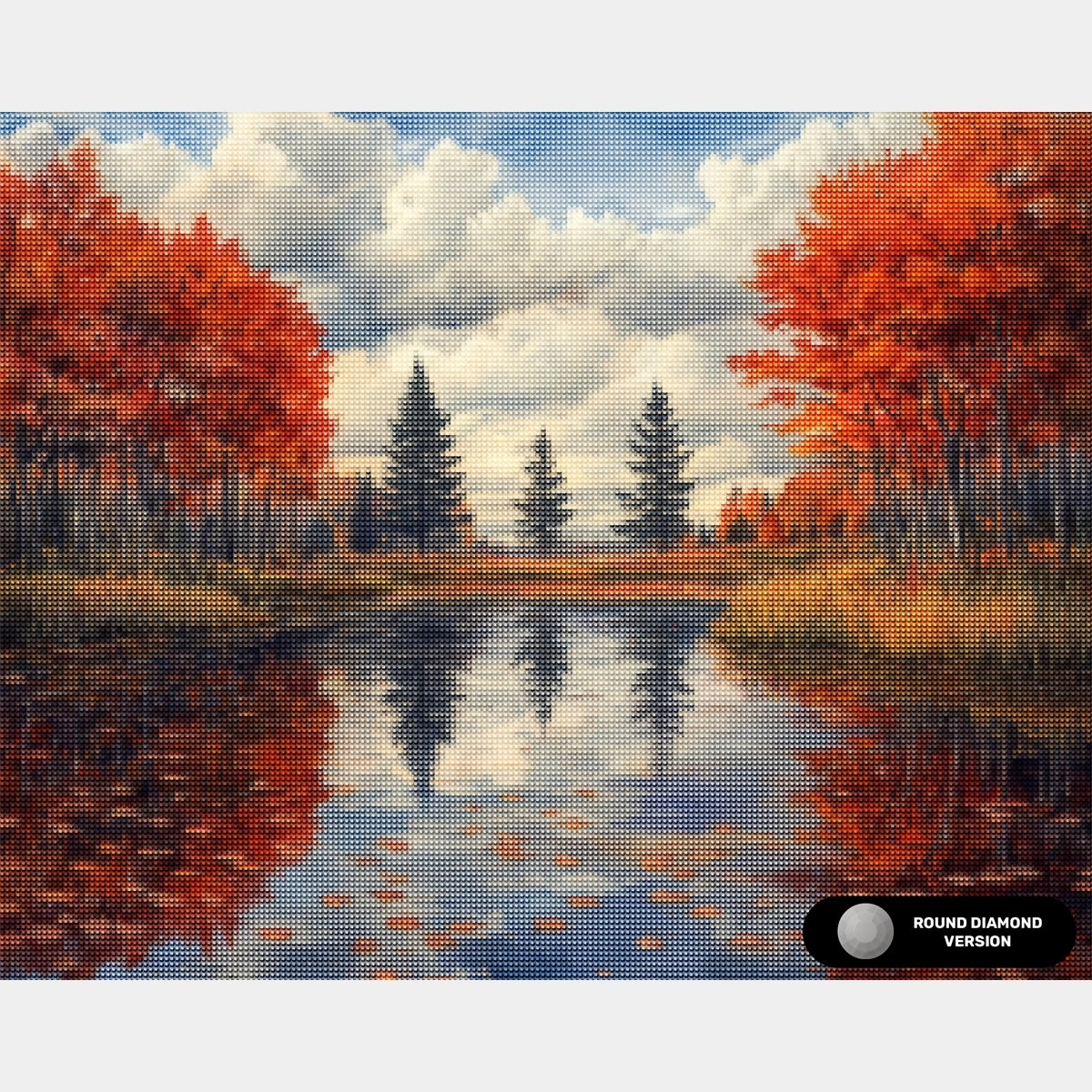 This Amber Reflections diamond painting captures the quiet beauty of an autumn forest reflected in a calm lake. Rich fall colors, detailed trees, and soft clouds come together to create a peaceful scene that feels soothing to work on and stunning to display.