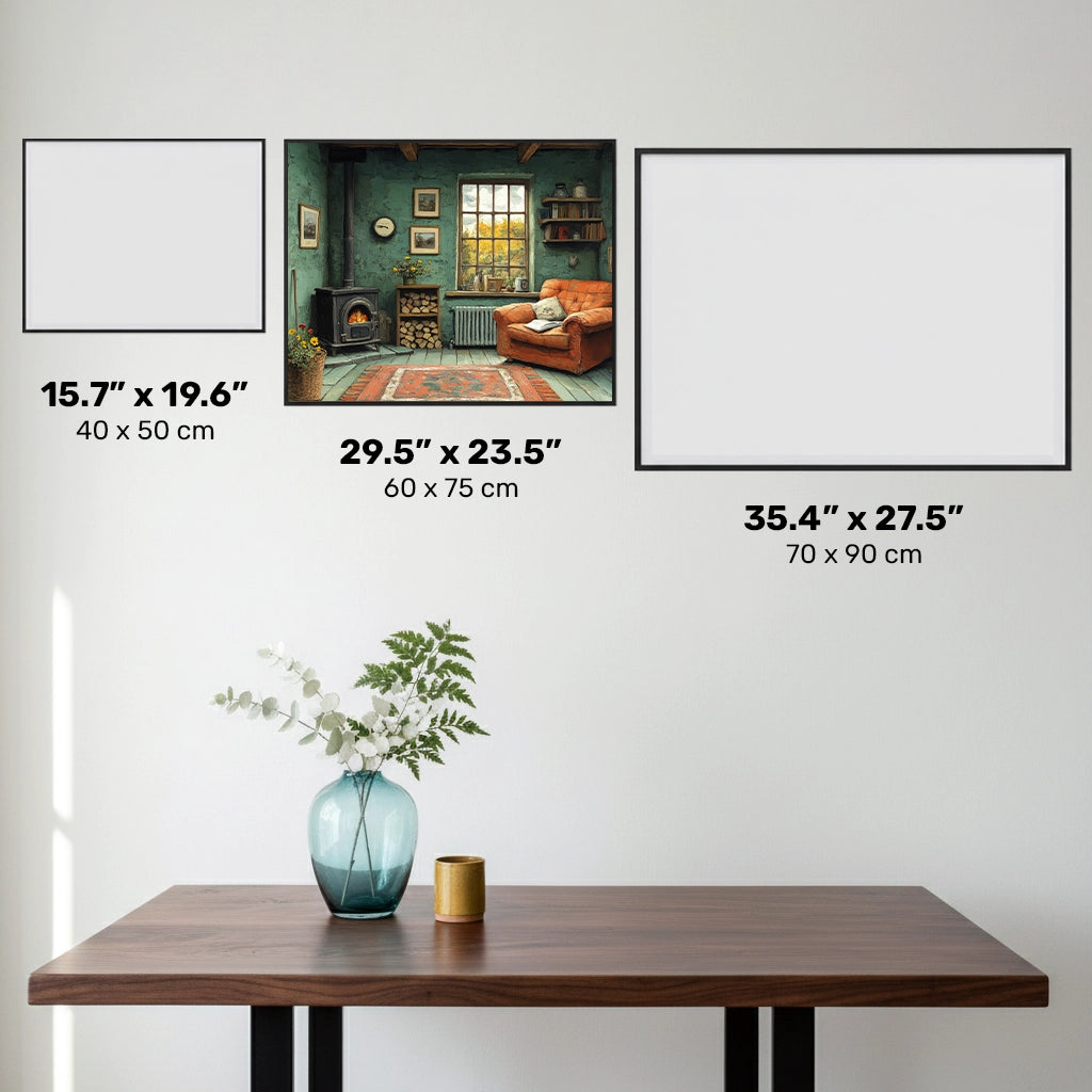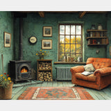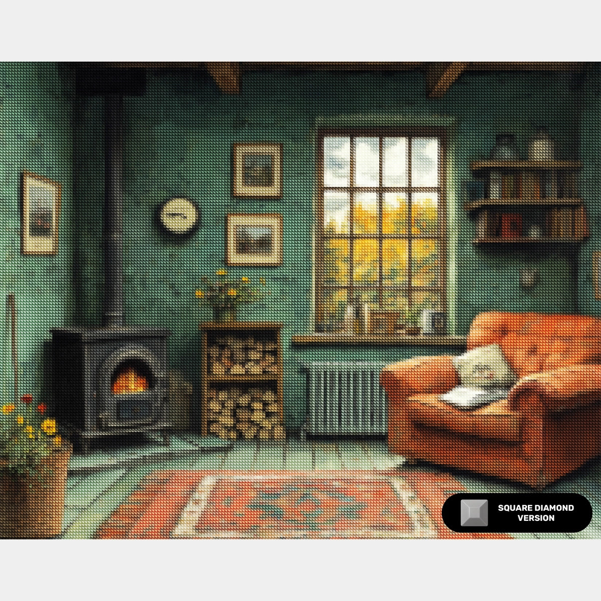 This Fireside Afternoon diamond painting captures a cozy room filled with soft autumn light, a glowing wood stove, and an inviting armchair. The textured walls, stacked firewood, and vintage décor create a peaceful atmosphere that translates beautifully into sparkling diamonds.