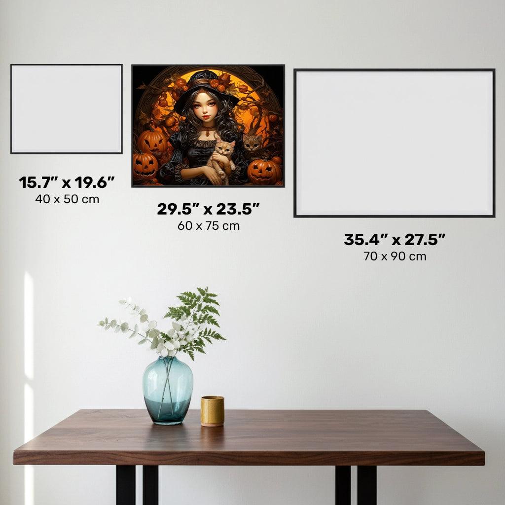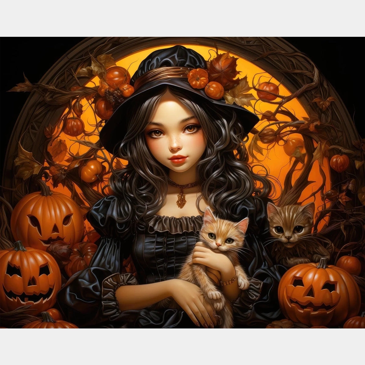 Capture the essence of Halloween with our 'Halloween Ritual' diamond painting kit. This enchanting design features a playful witch performing a magical ritual, accompanied by her young apprentice and a curious kitten. The scene is filled with glowing pumpkins, falling autumn leaves, and the mystery of All Hallows' Eve. As you place each diamond, you'll reveal a scene full of Halloween magic that sparkles with life. Whether you're a beginner or a seasoned crafter, this kit offers a fun and creative way to celebrate the season.