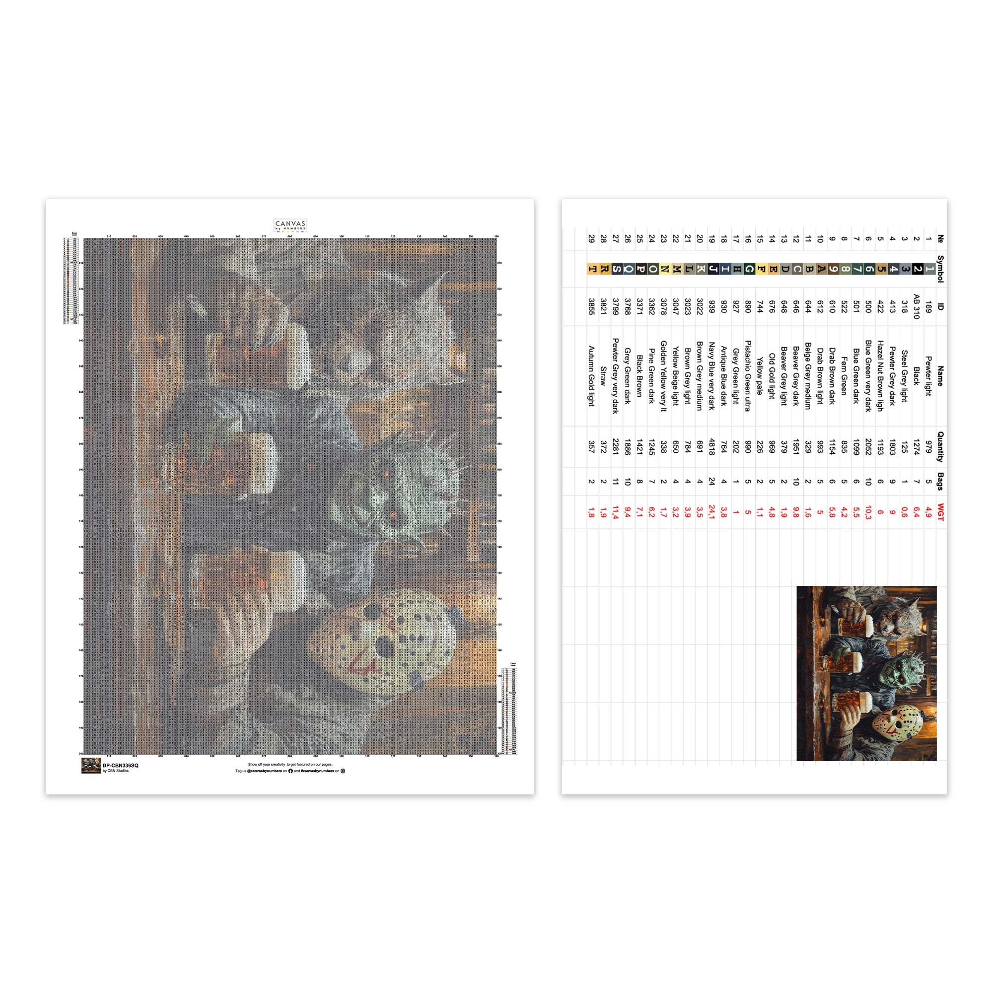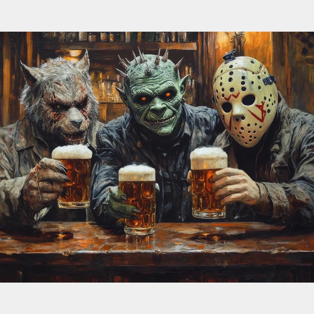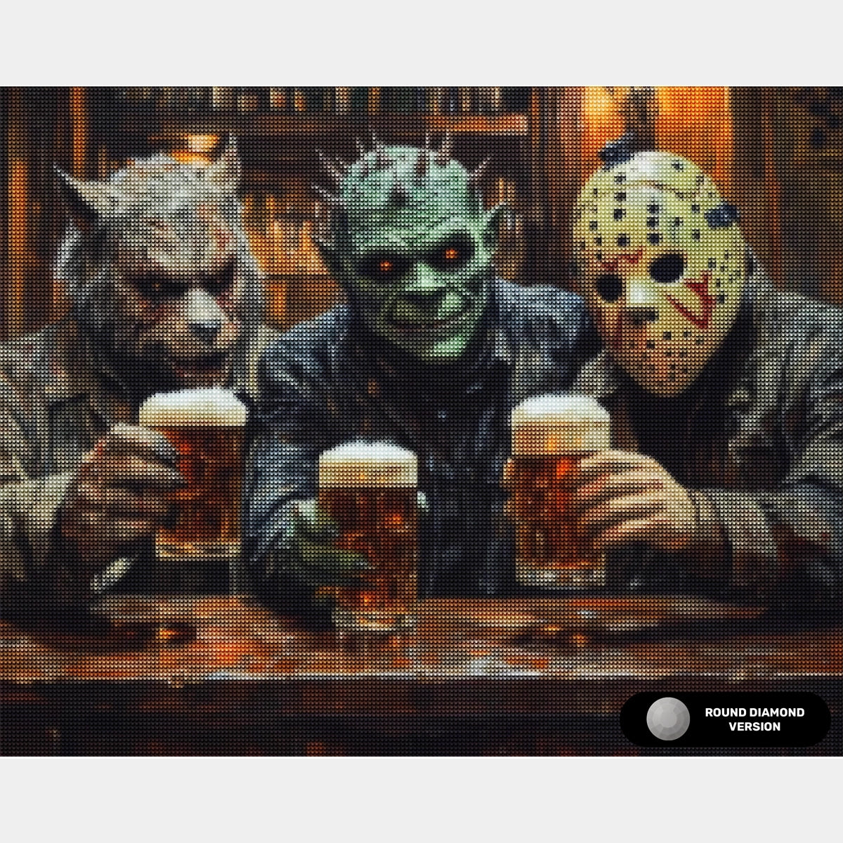 This Haunted Cheers diamond painting brings a group of classic Halloween monsters together for one oddly cheerful celebration. Each character has its own quirky expression and costume details, and the bold color palette makes the scene fun to complete. Great for October crafting or as a Halloween decoration with personality.