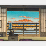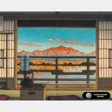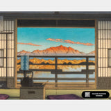 This Morning at Hot Spring Resort in Arayu diamond painting captures the peaceful beauty of a traditional Japanese interior opening onto a sunlit mountain view. The warm orange peaks, calm water, and soft blue sky create a serene atmosphere framed by shoji screens and quiet details. It’s a gentle moment of stillness and comfort.