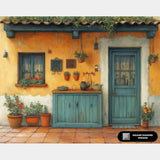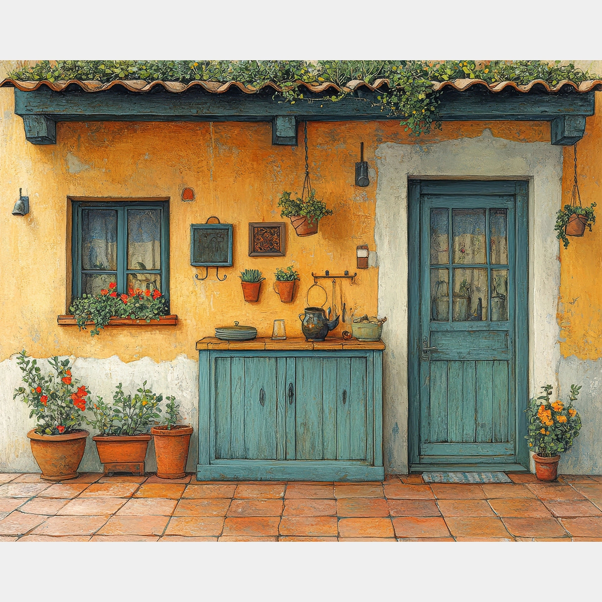 This Tradition and Sunlight diamond painting captures a warm countryside patio with sunlit yellow walls, teal doors, terracotta pots, and hanging plants. A cozy, vibrant scene perfect for lovers of rustic European aesthetics.